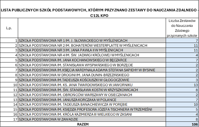 Wskaźnik C12L „Sale lekcyjne w szkołach zawodowych i instytucjach kształcenia ogólnego wyposażone w narzędzia informatyczne w celu umożliwienia nauczania zdalnego” w Gminie Myślenice, będzie realizowany w następujących lokalizacjach:Szkoła Podstawowa Nr 1 im. Juliusza Słowackiego w Myślenicach